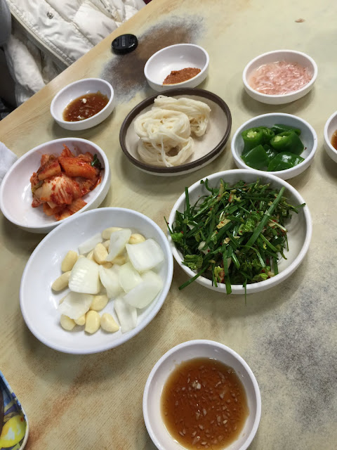 아줌마 (韓國大媽/ 阿姨)知道我們是外國人,就很親切的教我們該怎麼吃,只是,禁止跟長輩說 "嗯",因為在韓語 응 (嗯) 是半語,會不禮貌,아줌마 聽到會罵喔!